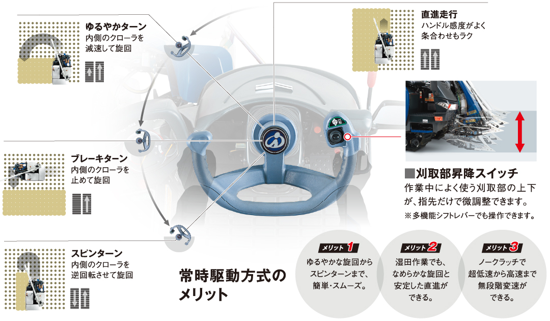 常時駆動方式で、直進中も旋回中も左右両クローラを駆動。方向転換や条合わせもなめらかに行えます。