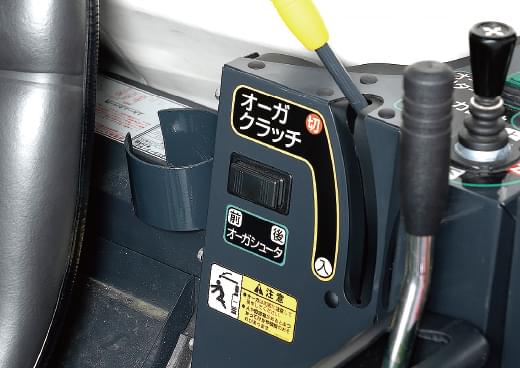 巻き込まれ事故を防ぐ両手操作方式。手こぎレバーと手こぎスイッチを同時に押している間だけフィードチェンが駆動するので安心です。