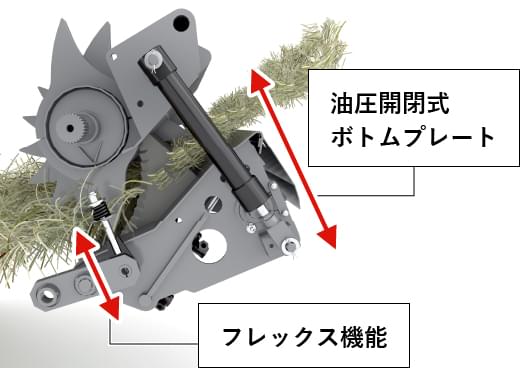 ISEKI WELGER独自の機能で、機械停止のロスを低減します。独自のフレックス機能により一時的に大量の草が入ってもカッティング部が可動し逃げる事で詰まりを低減します。万一詰まった場合でも、ボトムプレートを油圧で開く事でキャビン内からリカバリー可能です。