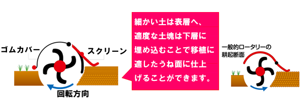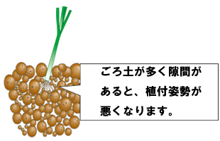 砕土が悪くうね面に凹凸があると、植付け深さが一定にならない、土寄せが不十分で姿勢が悪くなる、植付後に風で苗が倒れる不具合が生じることがあります。
