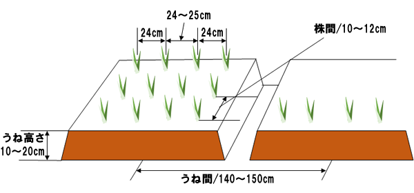 地域によって様々なうね形状があるので、栽培体系に応じて機械を選択してください。うね幅140cm程度で、うね高さ25cmの4条植えマルチ栽培が主流です。