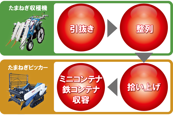 たまねぎ収穫機とたまねぎピッカーを併用することで重労働からの解放、効率UPにつながります。
