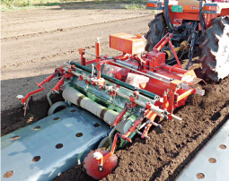 セルトレイで育てた苗を全自動野菜移植機で植付けします。