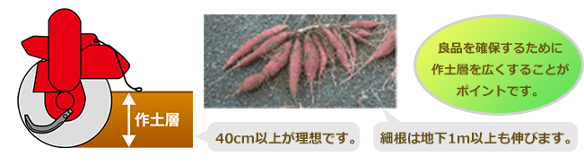 かんしょの根は地中深くまで広がるため、深層部からの養分吸収が旺盛となり、多量の肥料は必要としません。