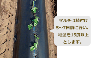 無マルチ栽培の場合、窒素・カリをうね間に施し、中耕を兼ねた除草や、除草剤を適期に散布します。