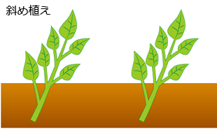 斜め植えとは、つる苗を斜めに植え、かんしょの数を制限し、一粒を大きくする栽培方法です。短期での収穫が可能で、加工用栽培に適しています。