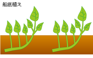 舟底植えとは、つる苗を横から見て船の底の形になるように植え、かんしょ同士の干渉が少ない育て方です。形の良いかんしょが得られやすく、青果用向け栽培に適しています。