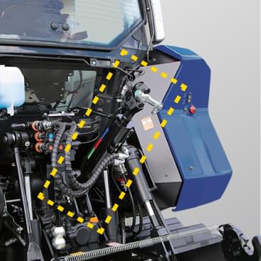 フックエンド式ロアリンクと油圧トップリンク、外部操作スイッチによって、作業機の着脱を簡単かつスピーディに行うことが可能です。
